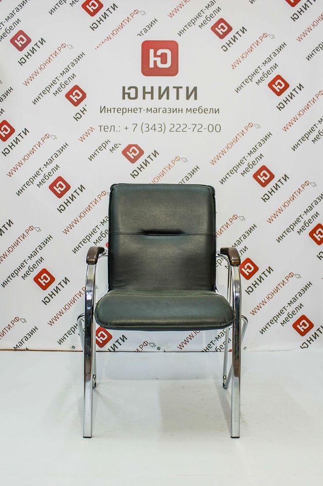 Стул с комфортными сидением и спинкой. Каркас состоит из хромированной металлической сварной рамы. Подлокотники металлические с накладками, выполненными из массива дерева.