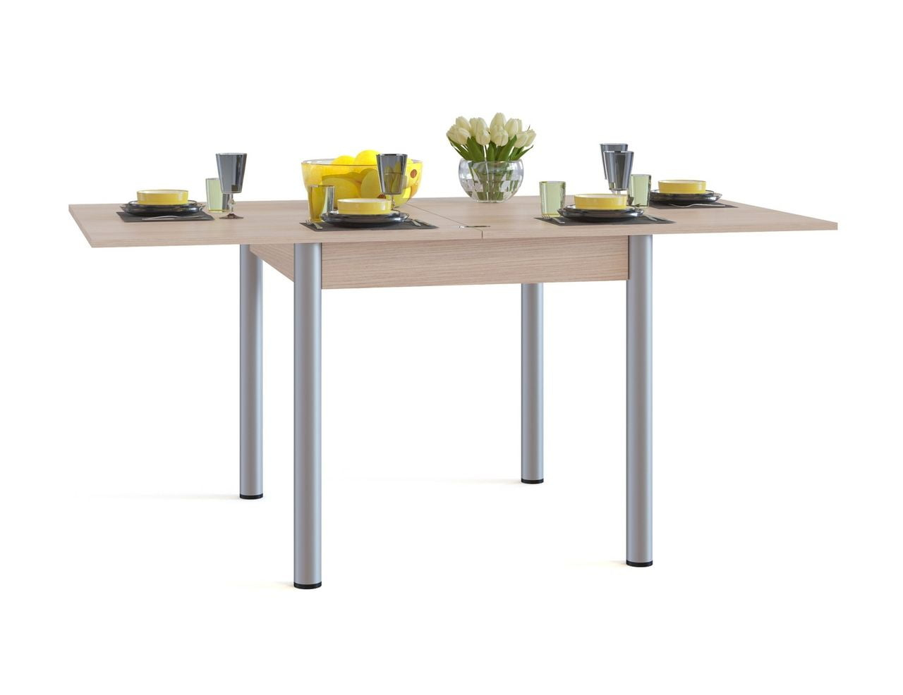 Классический обеденный стол на металлических ножках. Модель прекрасно подойдет для небольшой кухни за счет компактных размеров. Стол оборудован раскладным механизмом, который позволяет увеличить столешницу до 1600 мм. Чтобы разложить стол, нужно отодвинуть столешницу в сторону и раскрыть как книжку. Легко и практично. Обратите внимание! В разложенном состоянии петли будут на поверхности столешницы. Столешница и подстолье изготавливаются из ЛДСП толщиной 16 мм. Края столешницы обработаны кромкой ПВХ 2 мм, остальные детали — ПВХ 0,4 мм. Ножки — металлические.