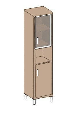 Каркасы шкафов выполнены из ЛДСП толщиной 25мм., кромка ПВХ т. 2мм.  Задняя стенка из ХДФ т.4мм разрезная в паз. Внутренние полки из ЛДСП 18мм., кромка ПВХ т.0,8 мм. ЛДСП т 25мм., кромка ПВХ т. 2 с фасадной стороны, кромка ПВХ т. 0,8 с трех сторон. В упаковке один горизонтальный щит, который можно устанавливать вверху или внизу изделия. Опора регулируемая, цвет алюминий. Стеклянная дверь в алюминиевой рамке, стекло - тонированное пленкой, бронза. Ручка скоба, цвет алюминий. Двери вкладные.