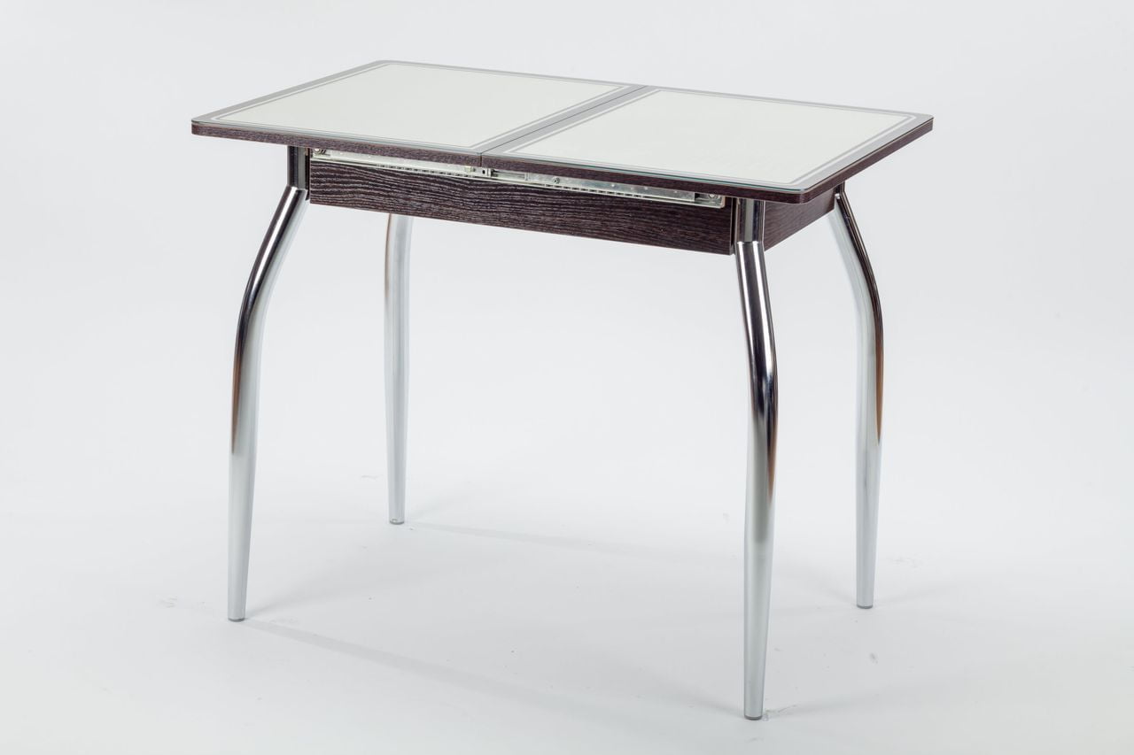 Механизм раскладки синхронный - при раздвижении стола, потянув одну часть столешницы, вторая часть двигается автоматически одновременно. В механизме на синхронное раздвижение влияет присутствие тросиков. Вставка состоит из двух частей, закрепленных между собой петлями (как книжка) и закреплена к столу осью.