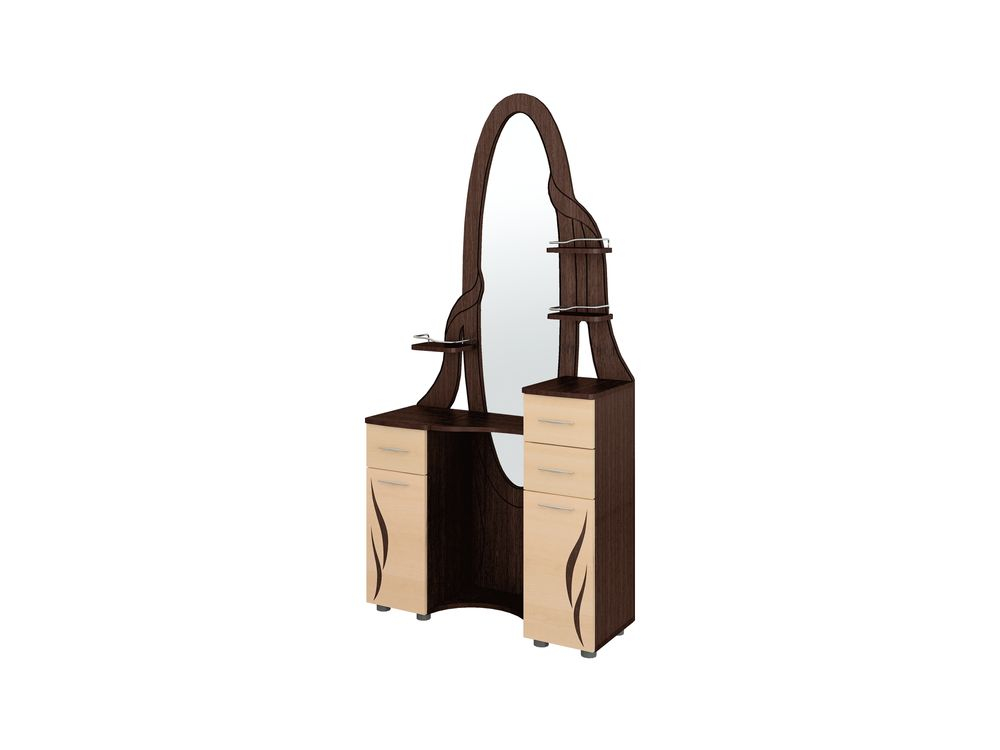 Туалетный столик Орхидея 3.10 — функциональный предмет мебели, снабжен двумя тумбами и тремя выдвижными ящиками, большое зеркало позволит увидеть отражение "во весь рост", полочки имеют ограничители из прутка